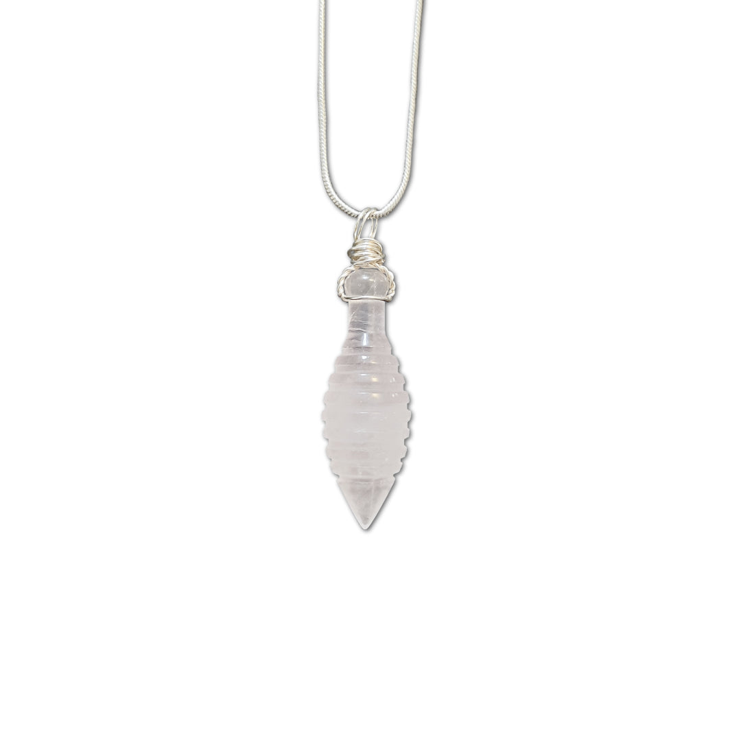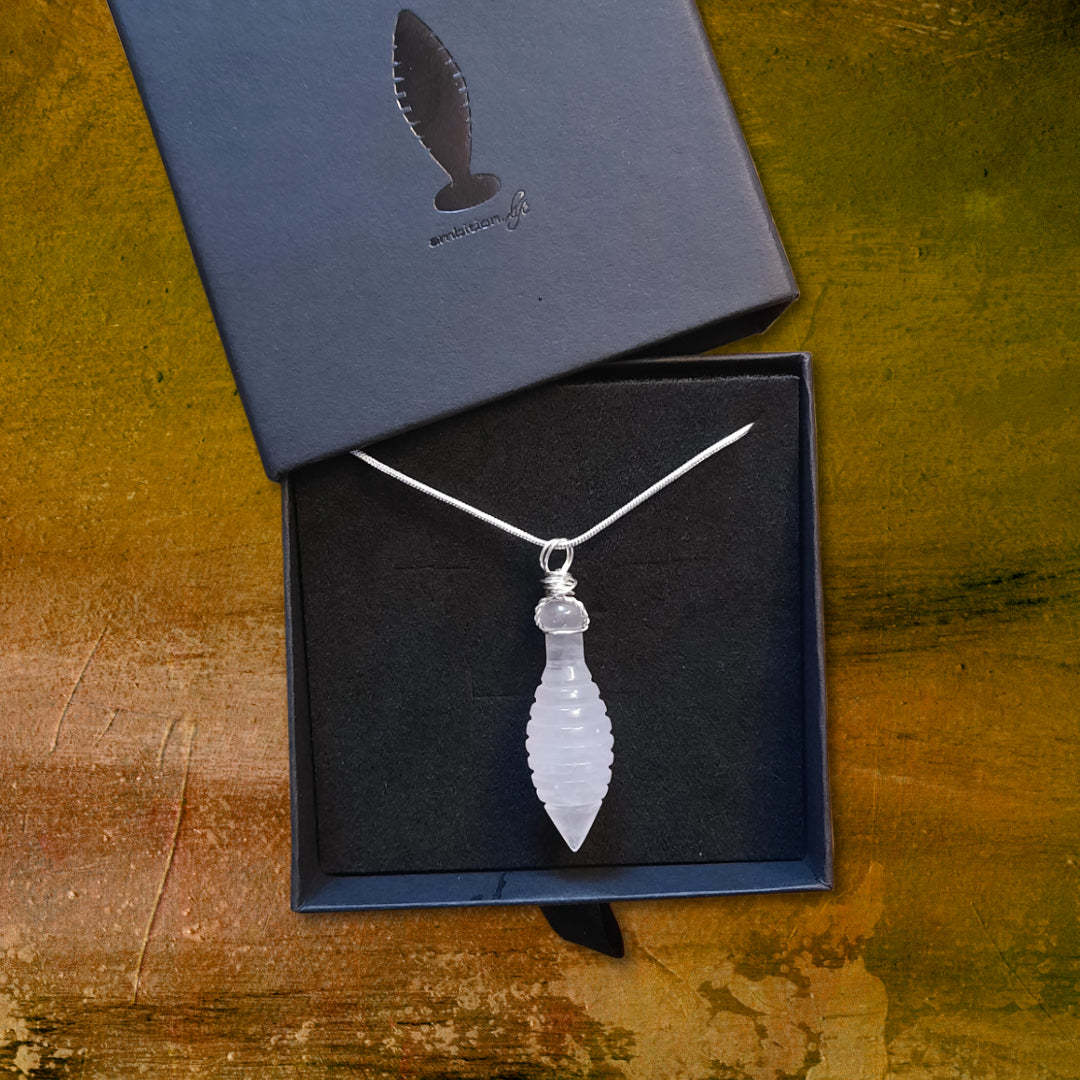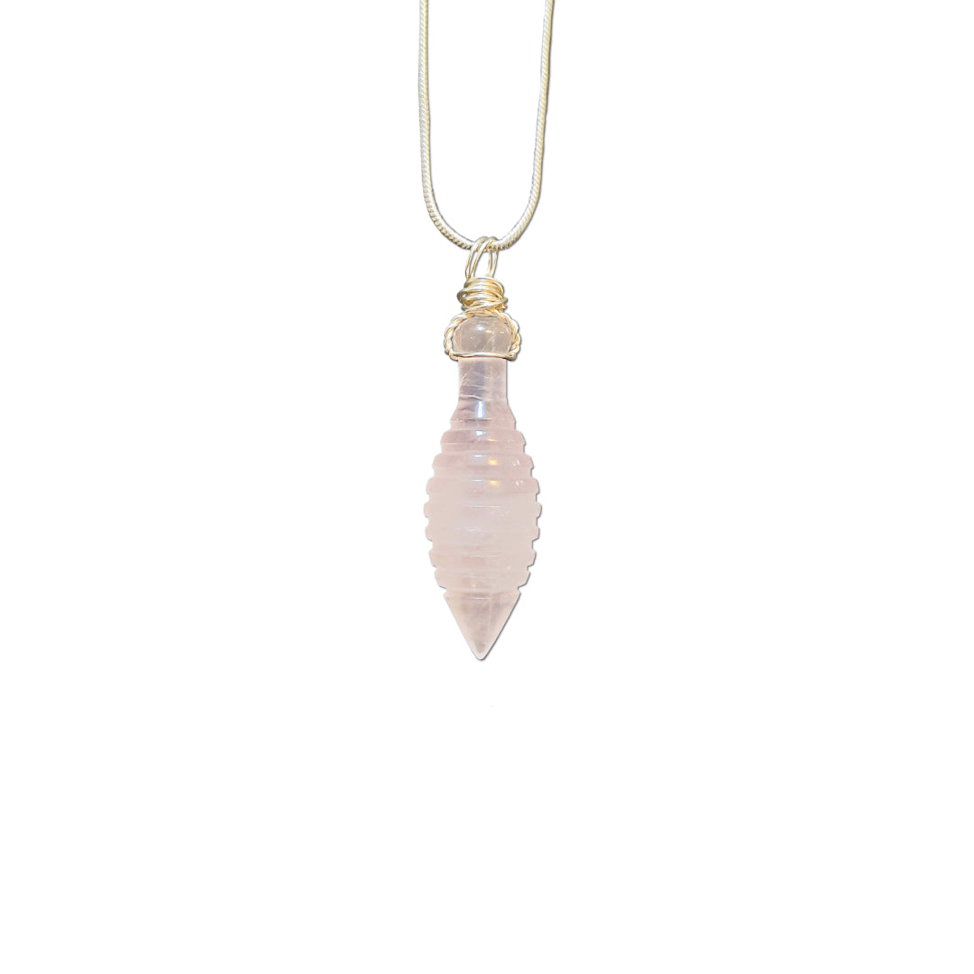 Die Grundform dieses Amuletts wird aus einem ganzen Block Rosenquarz vorgefräst. Anschließend erfolgt die Feinarbeit von Hand, wodurch jedes Stück seine individuelle Form und Energie entfalten kann. Die edle Öse wird aus Silberdraht gefertigt und mit einer versilberten Kette geliefert – bereit, getragen zu werden.